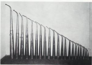 He hit upon the idea of having simple single-tone copper horns constructed, pitched like organ pipes, and of fitting out a larger team of musicians with them. Each one of these pitiable hornists had now nothing more to do, than to blow only the single tone of his horn whenever it was supposed to be sounded in the piece being played. The greatest difficulty naturally consisted in the razor-sharp attention to all of the rests. One can imagine how much patience and drill were necessary, in order to train 30 to 40 young huntsmen, until they were able to perform faultlessly difficult pieces with rhythmically complicated tone figures or fast passages. [p. 208]