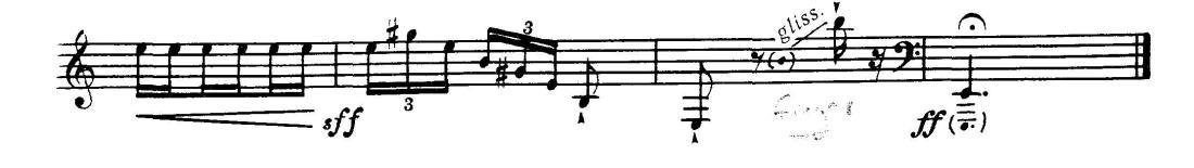 Be aware that it’s very easy on these repeated passages for tension to build and build – this will kill your technique, range, and endurance!  Take every opportunity to relax, especially the left hand, and release some residual tension.  A great place to do this is right before the final molto vivo section.  In the last four measures, try to keep a good middle register setting even as you descend down to the low E – this will do wonders for the gliss. up to the B.  If you let everything go and try to crush the low E it can be problematic getting back into the middle and upper register right after. One last tip is to finger the glissando – for some reason this just felt much more comfortable to me.