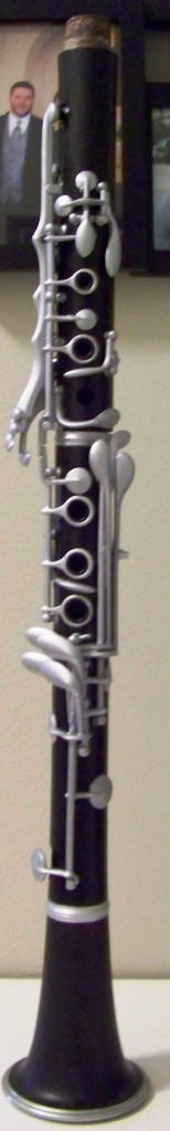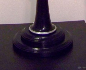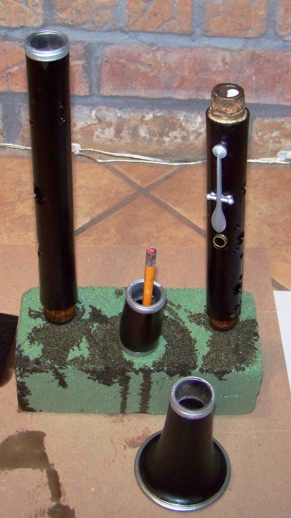 One other project that I forgot to mention in my Summer Plans post was the clarinet lamp pictured at left.  This clarinet belonged to my late grandfather, who played it in the North Carolina Symphony in the late 1930s.  When it was passed along to me I wasn’t exactly sure what to do with it, but I knew that I wanted to preserve it in some way. Sadly, I found out that it wouldn’t be worth it to restore the instrument to playing condition – imagine the wood sitting in a non-climate controlled basement for the last fifty plus years! – every bit of moisture had been leeched out of the wood.  However, there weren’t any major cracks in the body, and all of the keys were in decent condition, so my wife and I decided to turn it into a lamp, which we gave to my dad as a Father’s Day present. I neglected to take any “before” pictures, but needless to say it didn’t look anything like the finished product.  The first thing we did was remove all of the keys – actually one of them was more or less permanently attached due to a stripped screw head – and treat the wood with Danish oil. After thoroughly cleaning and then painting the keys, we began the long process of reattaching everything (see the picture at left).  My advice to anyone considering this type of project is to label the keys meticulously and sketch a diagram as you remove each section.  I didn’t do this, and I wouldn’t have been able to get the thing back together without my patient and resourceful wife!  Many of the screws and pins were unusable after disassembling the instrument, so we used various other methods (superglue) to reattach everything.  Knowing that the instrument would not be played again made the process a little less complicated, but it was still a complex task for my horn-playing brain.  Thankfully I was able to find several helpful diagrams online, which were lifesavers.  Once we put the clarinet back together, we had the body of our lamp.  We then sprayed a clear lacquer coating over the entire instrument to seal and protect it. The rest of the process was involved, but not nearly as tedious as everything up to this point.  My wife fashioned and painted a base for the lamp, and we used a bottle-lamp kit and shade purchased from a local home improvement store for the rest.  Two elements of the design that you can’t see in the pictures are the hollow, threaded metal tube running from the bottom of the base to the lamp socket.  The wire is contained inside this tube, and the socket attaches to it at the top of the lamp.  The metal tube is attached to the top and bottom of the base with threaded collars, the lower one being countersunk into the bottom of the base so that the lamp rests evenly.  Finally, we cut a shallow groove in the underside of the base for the cord, and glued on a felt layer so that the lamp doesn’t scratch anything where it sits.  Wiring the socket was fairly straightforward, as was attaching the shade.  The lamp does work, and looks pretty good too.  There are some pretty ornate lamps of this type out there (check out this site to see some of them), but this was the first project of this sort for me, and I am very pleased with the results.  Will I be making other instrument lamps in the future?  I’m not sure, but it certainly is a possibility.  I owe a huge thanks to my wife for her help on this project.  She did most of the painting, and provided much needed artistic advice.  I shudder to think what the lamp would have looked like without her help!
