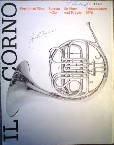 I practiced some of these pieces quite extensively in graduate school but never performed them – Douglas Hill’s Song Suite, for instance – but others I’ve really only read through a couple of times, like the Sonata in F by Ferdinand Ries (cover image at left). Ries was a contemporary of Beethoven, and there are some striking similarities between their horn sonatas. It’s a great piece in its own right, and is definitely near the top of my “to be performed soon” list. One interesting note about my copy is the signatures on the cover. This copy belonged first (I assume) to John Barrows, and then Nancy Becknell, who taught alongside Douglas Hill at the University of Wisconsin-Madison. During my doctoral studies Ms. Becknell donated several boxes of music to Professor Hill’s current horn students, and I was lucky enough to get my hands on this edition of the Ries sonata.
