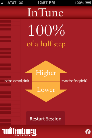 Although I haven’t thoroughly tested the effectiveness of InTune, I can say that it is very easy to use, and fun as well. It has numerous applications for use in private or classroom instruction, and other intonation games could easily be built off of the basic design. Here’s a screenshot.