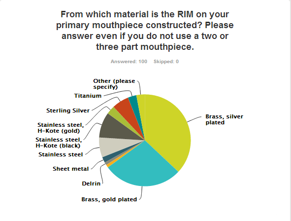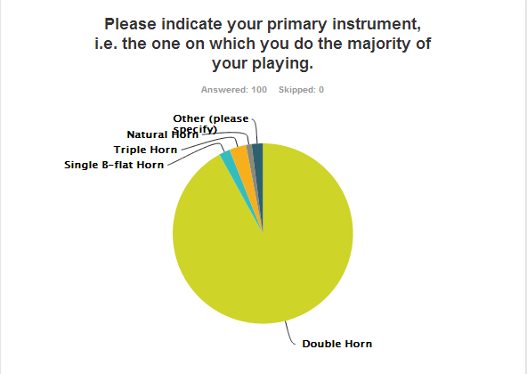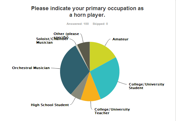 • A free account with Survey Monkey only allows a maximum of 100 respondents per survey. Therefore, the scope of the survey is limited. It was suggested that I create multiple surveys to allow as many respondents as were willing to participate, but this would have made working with the data much more difficult. In other words, Survey Monkey wouldn’t have collated all of the data from multiple surveys and created the neat graphs and charts you are about to see. Based on the participation in this one small survey, I think a much more comprehensive and wide ranging study of mouthpieces would be well received by the horn playing community.