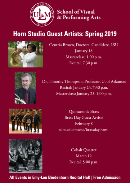 - Guest Artists Galore: We often have multiple guest artists on the ULM campus each academic year, but this spring we’ll have more than the usual number, including several fantastic horn players. Our first guest artist this spring was Centria Brown, a DMA candidate at Louisiana State University, studying with Professor Seth Orgel. Ms. Brown is a fellow native of North Carolina and earned her undergraduate degree at Wingate University. She gave a fantastic master class and recital, with a program including the Nelhybel Scherzo Concertante, Mozart 4, Krol Laudatio, and the Lars-Erik Larsson Concertino, op 45, no 5. This coming week we’ll be welcoming another guest, Timothy Thompson, Professor of Horn at the University of Arkansas. He’ll be performing a program of unaccompanied works entitled “Around the World with the Horn.” On February 8 we’ll host the Quintasonic Brass for our annual Brass Day workshop. In addition to a recital by Quintasonic Brass, the day’s events will also include a special horn pedagogy clinic and exhibits by Houghton Horns. To close out this impressive roster of horn artists, the Cobalt Quartet will perform a recital on March 12. Members include several prominent horn performers and teachers from across the country: Jena Gardner, Katie Johnson, Caroline Steiger, and Rose Valby. In addition to these horn players, euphonium virtuoso Demondrae Thurman will be in residence for two days, presenting a guest recital (Feb. 25), master classes, and more.