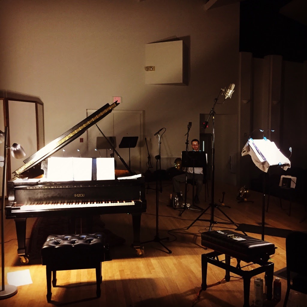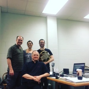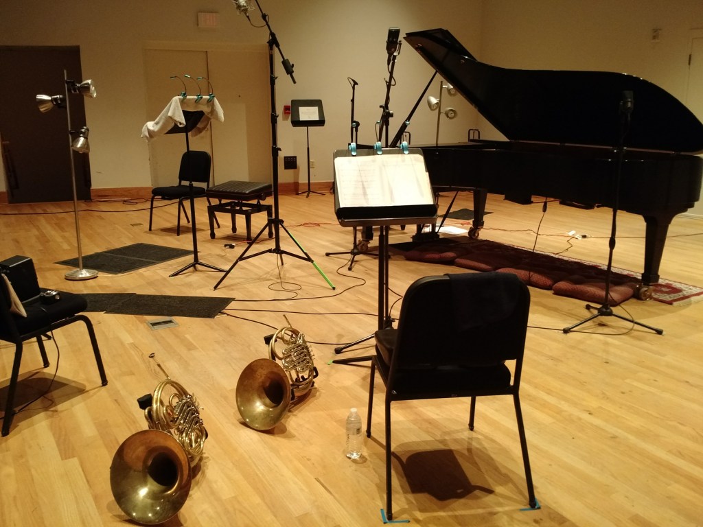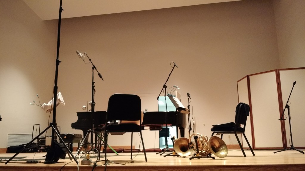 you don’t recognize his name I would be willing to bet that you own or have heard his recordings. I had not worked with Mr. Price previously, but after two solid six-hour-plus days of recording, I would recommend him to anyone without reservation! His incredibly discerning ears and easy-going demeanor made him a joy to work with as a producer and engineer. While I don’t know the exact technical aspects of what he did with microphone placement and other variables, I do know that the sound he was able to capture was great – warm and nuanced, with exactly the right balance among all three parts. And this was just from the raw takes! The final edited and mastered recording should be really fun! See below for a few shots of the stage setup.