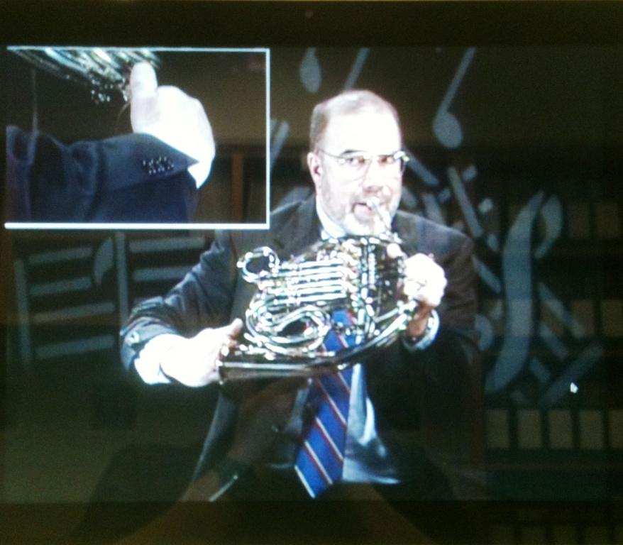Professor Faust’s commentary is informed by years of experience as a performer and teacher of the horn, and he concisely – but accurately – explains the acoustical phenomena behind hand stopping. All of his lecture material is accompanied by expertly played demonstrations, including musical excerpts by Beethoven and Saint-Saëns (performed on the natural horn, as shown in the above image), and a thorough demonstration of the overtone series. One innovative technique he uses is demonstrating stopped technique on a detachable-bell horn with its bell removed (see image below).