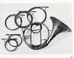 This is the third and final post in a series devoted to Kulturgeschichte des Horns (A Pictorial History of the Horn), by Bernhard Brüchle and Kurt Janetzky. You can view Part 1 and Part 2 by following the links. The first image is a set of horns from a Russian horn ensemble, a very unique type of horn choir. Here’s some background from the text.